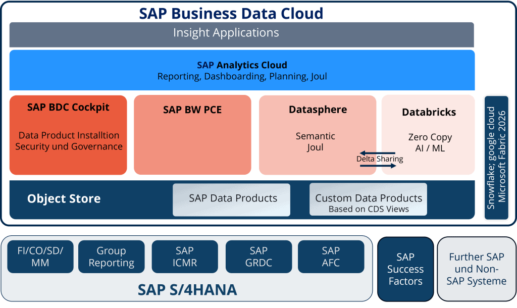BW/4HANA bleibt die stabile, transaktionsnahe Schicht für historisierte Datenbestände und strukturierte Kernprozesse. Es bildet weiterhin die Basis für zentrale Datenhaltung, ist jedoch nicht mehr der alleinige semantische Kern.